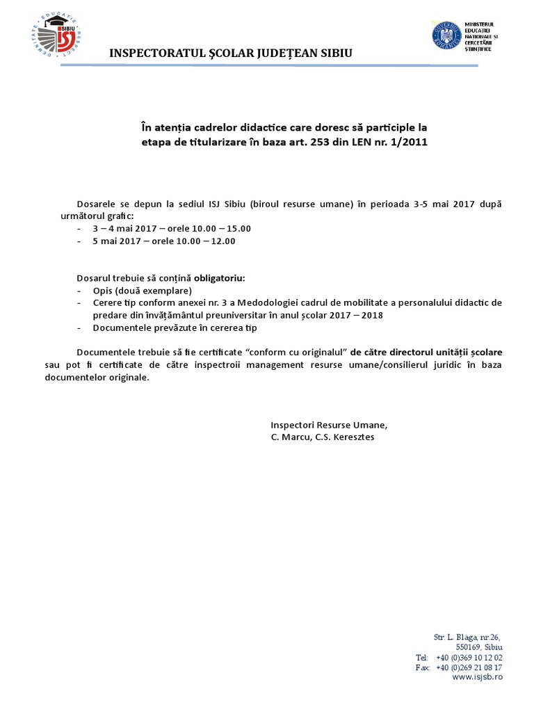 Titularizare In Baza Art 253 Din Legea Nr 1 2011 A Educatiei