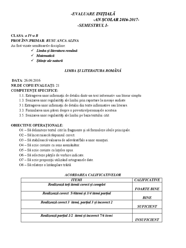 Calificative Si Competente Clasa I A Ii A A Iii A Limba Romana Si Matematica V Padureanu M Cerkez M Singer