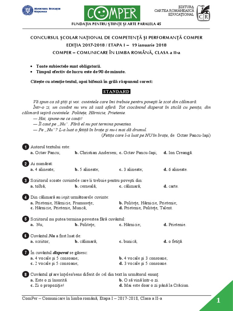 Etapa Nationala Comper 2018 Romana Subiecte Bareme Mai 2018