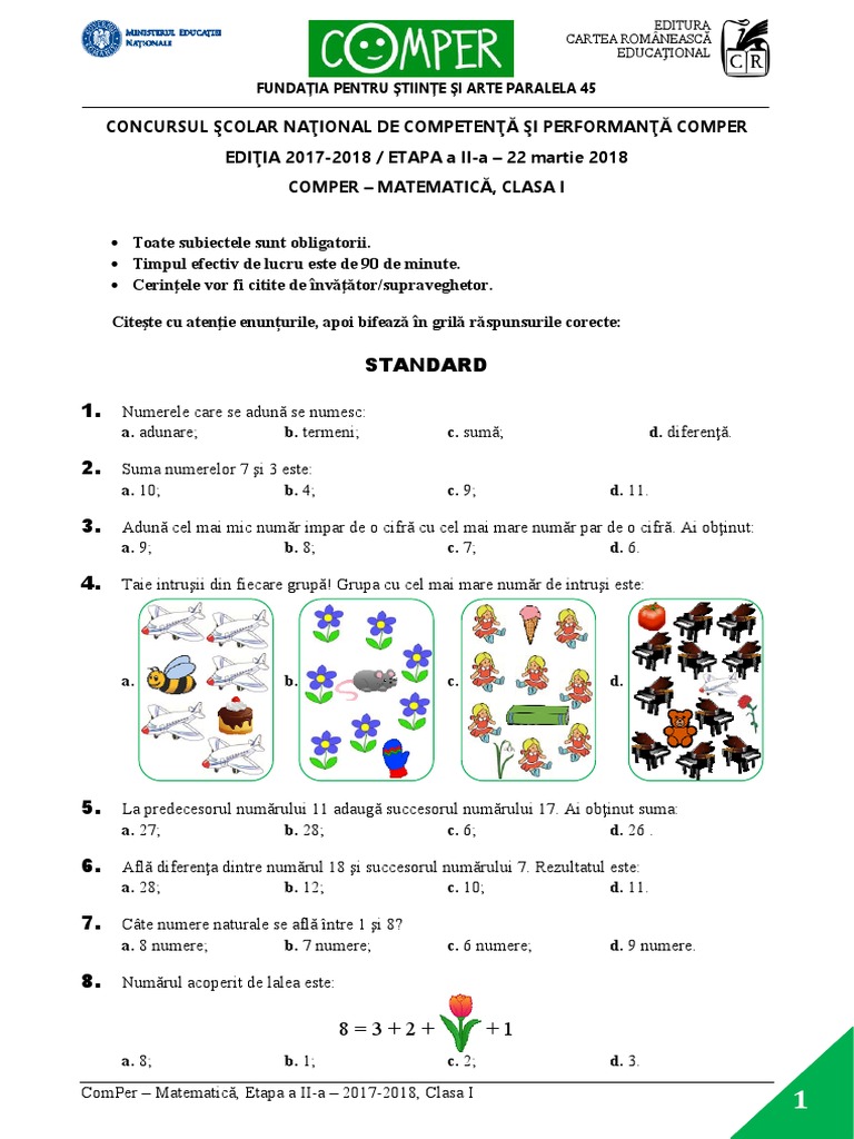 Concurs Comper Clasa I Subiecte Matematica Pentru Pitici