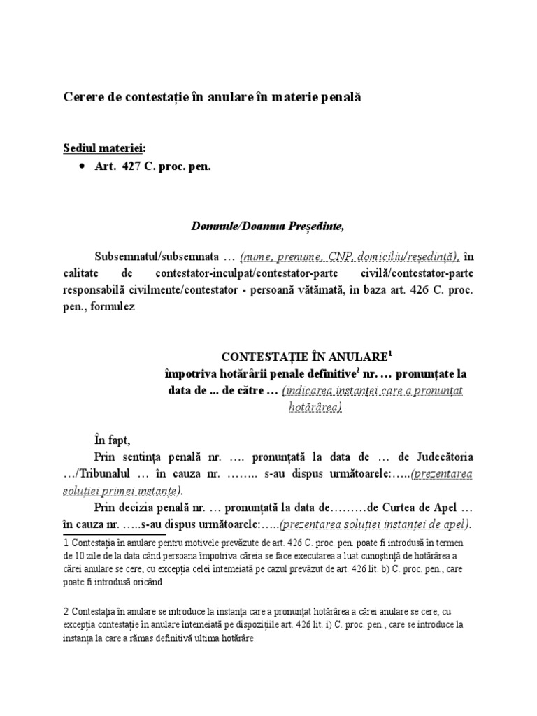Cerere De Contestatie In Anulare In Materie Penala