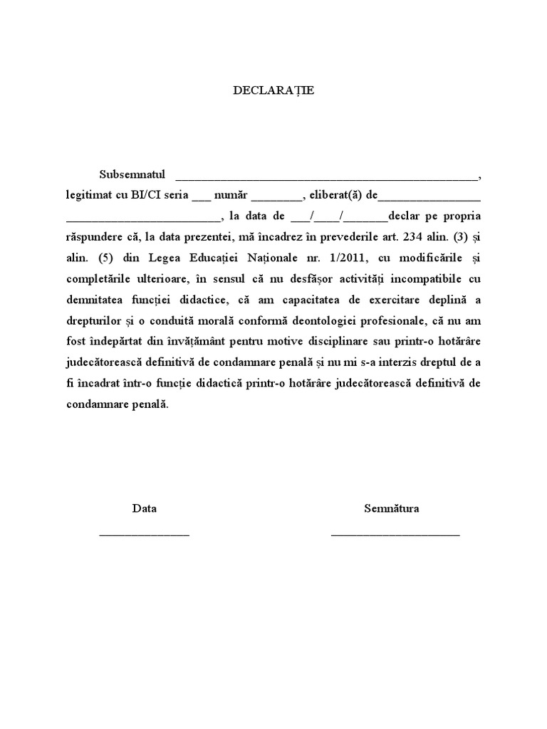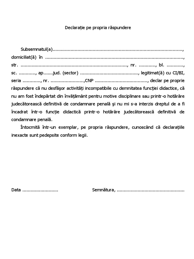 Declaratie Pe Propria Raspundere Titularizare
