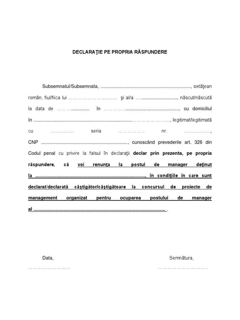 Model Declaratie Pe Propria Raspundere Renuntare La Post De