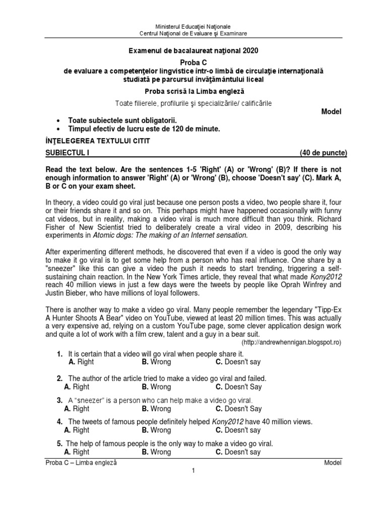 Subiecte Bac 2020 Engleza