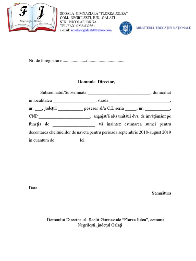 Model Cerere Decontare Naveta Cadre Didactice 2019