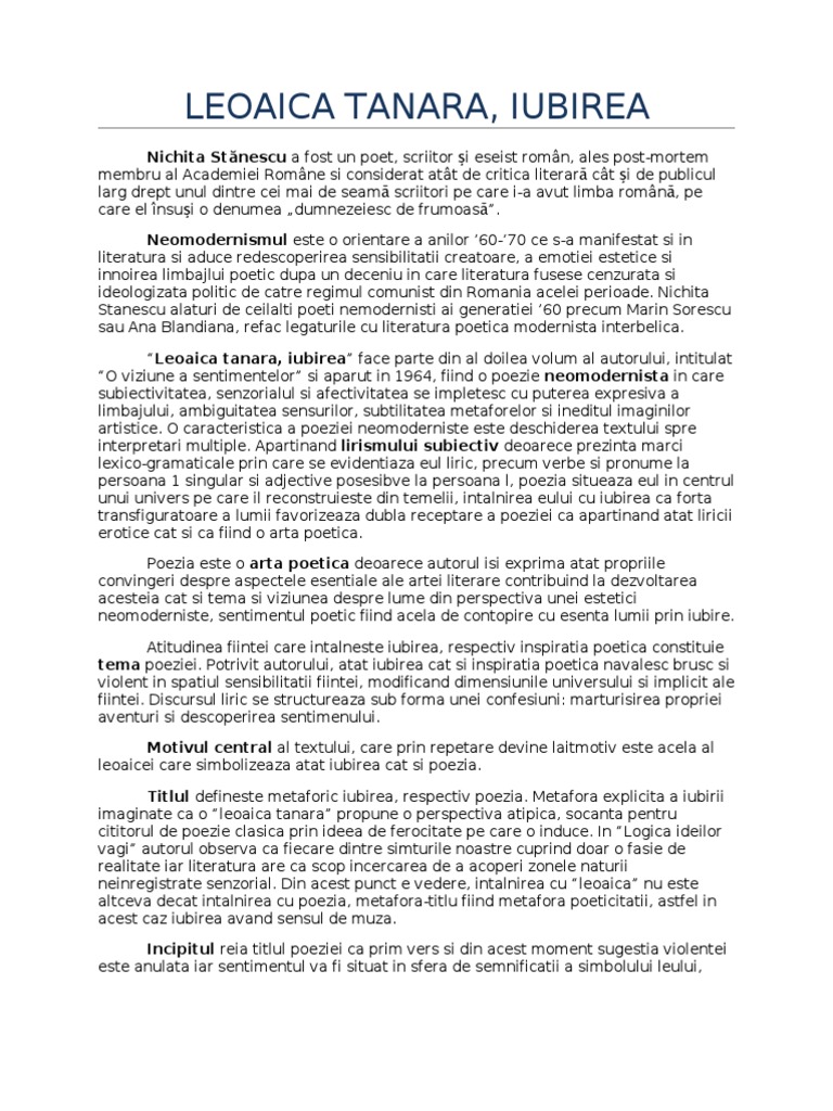 Leoaica Tanara Iubirea De Nichita Stanescu