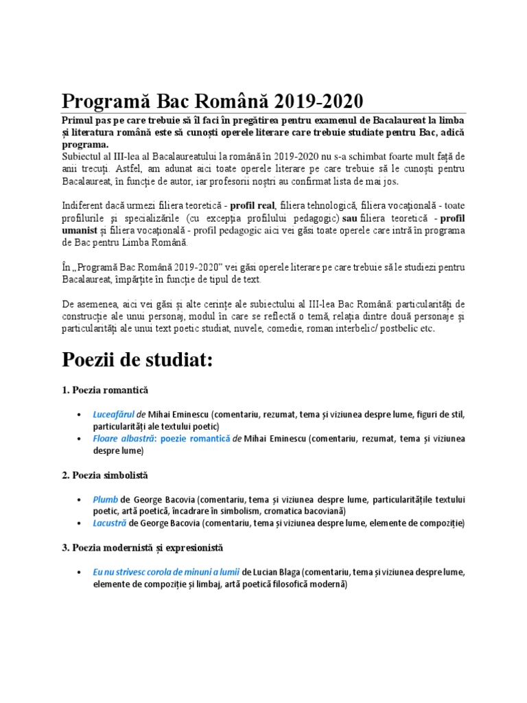 Programa Nouă Bacalaureat 2020 Limba și Literatura Romană Edupedu