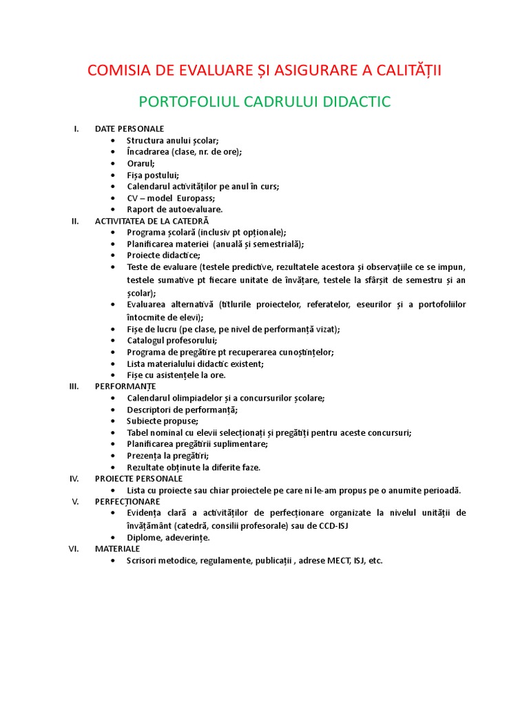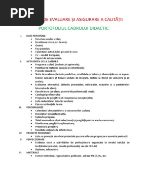 Portofoliul cadrului didactic aracip. Pe mine m a ajutat foarte mult la inspectiile pe care le am avut. Necesare a fi introduse în portofoliul personal prezentându le opisul portofoliului cadrului didactic anexa 1. Model clasic de întocmire al portofoliului fiecărui profesor cuprinzând datele personale activitatea la catedră performanțele proiectele personale cursurile de perfecționare și procesele verbale ale gradelor didactice dobândite precum și diverse materiale decizii men isj etc. Instrument de lucru ceac.