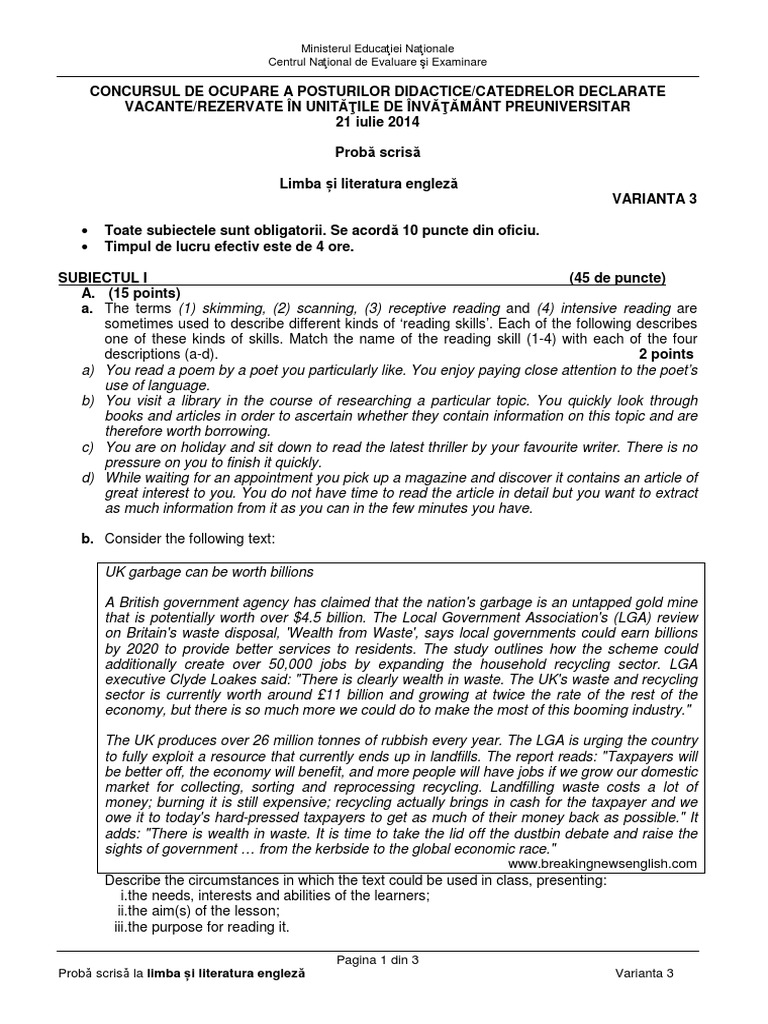 Subiect Titularizare Limba Engleza 2011 Tide Environment