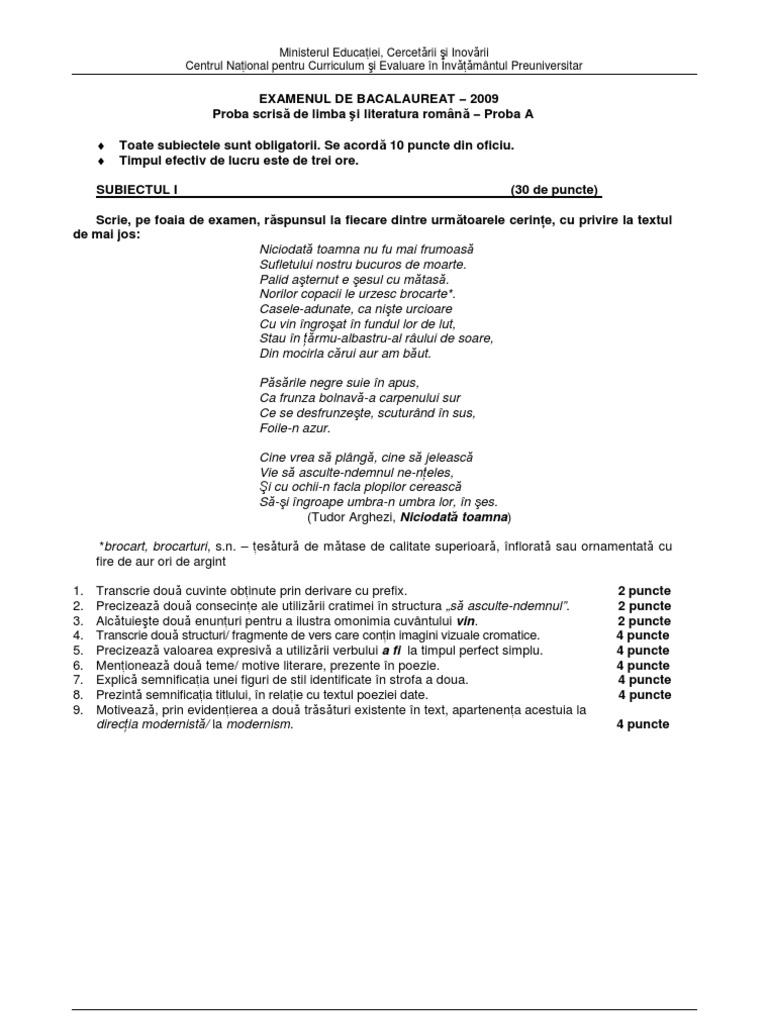 Barem Simulare Bac Romană 2019 Toamnă De Suflet De Tudor Arghezi