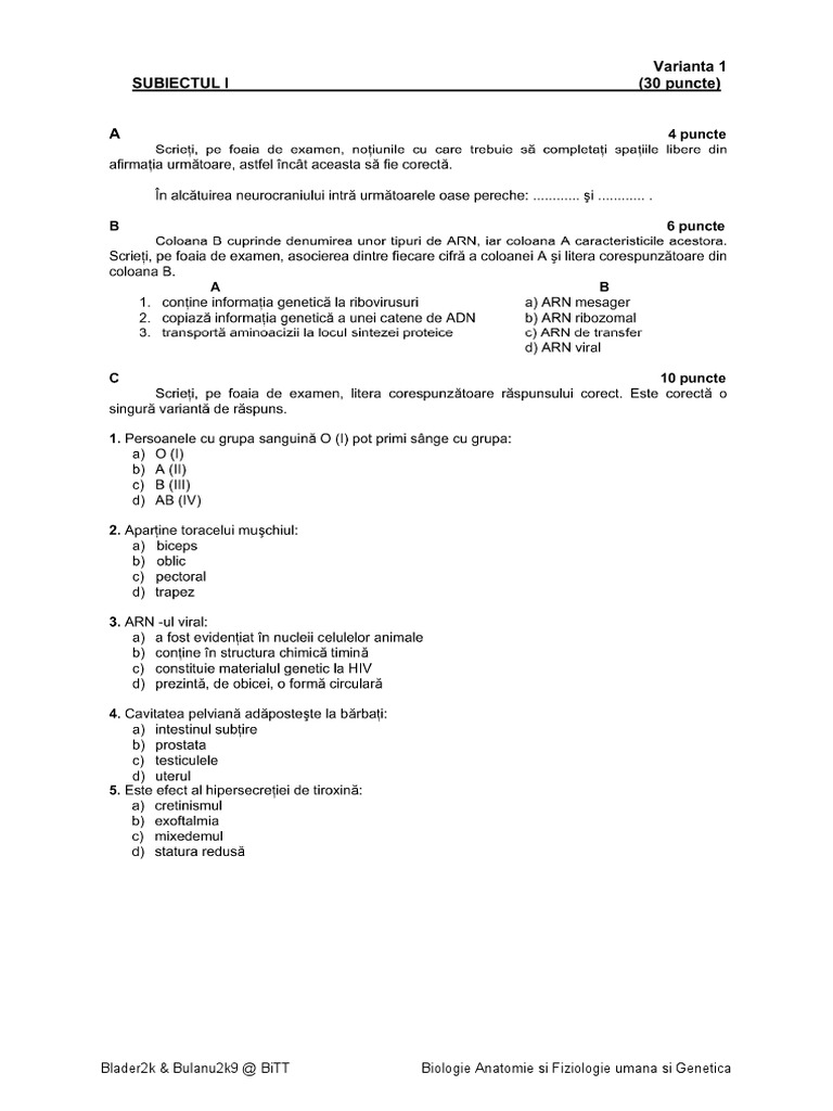 Variante Biologie Anatomie Si Fiziologie Umana Si Genetica